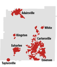 Incorporated Cities: Adairsville, Cartersville, Emerson, Euharlee, Kingston, Taylorsville and White