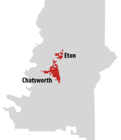 History:† Murray County, created in 1832 from part of Cherokee County, was named for Thomas Walton Murray, a Speaker of the Georgia House of Representatives. One version of how Chatsworth got its name, is that a sign fell off of a passing freight car. The sign was placed on a pole by the tracks and the name stuck. Among the county’s attractions are the Vann House Historic Site at Spring Place. Constructed in 1805 for James Vann, a Cherokee chief, the two-story red brick home was built alongside the Federal Road, a major early path in northwest Georgia.